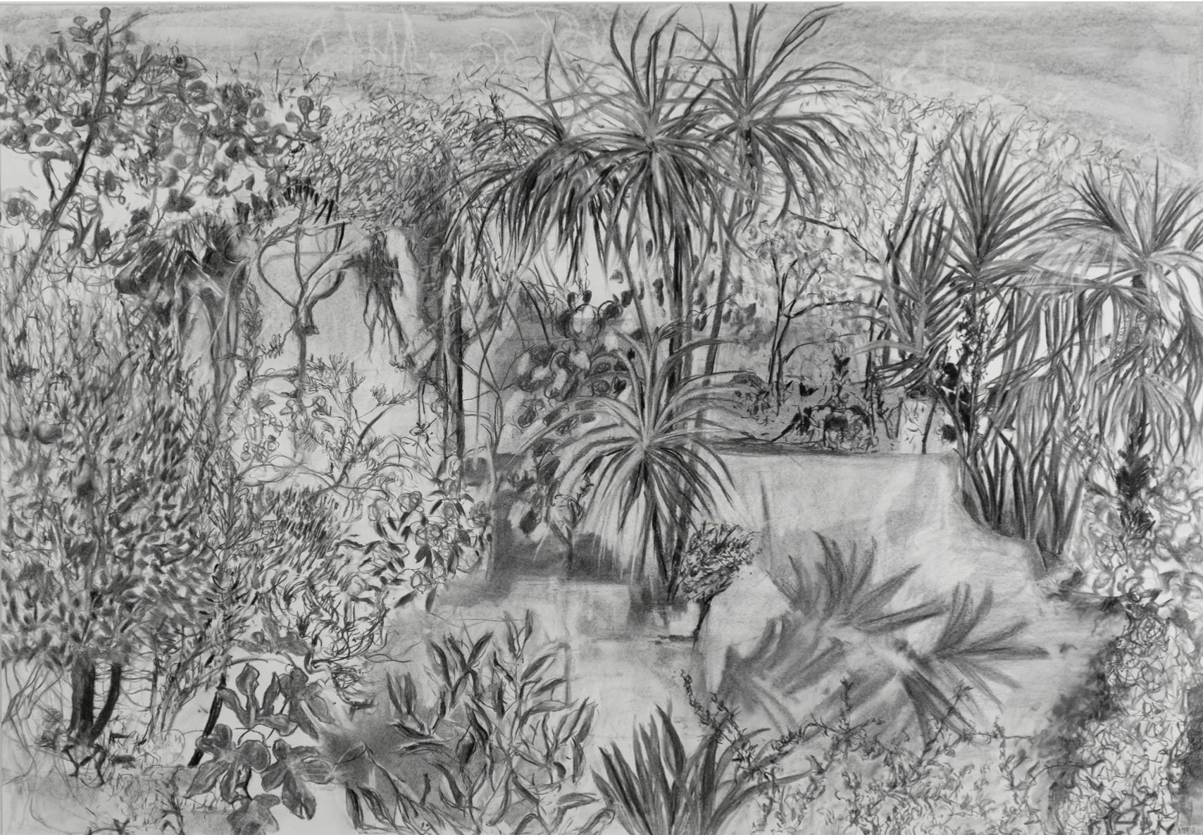Alcuni dei disegni mostrano viste più tradizionali del giardino, in cui si raffigurano densi strati di rami e di fogliame rigoglioso intrecciati in uno spettacolo vivo e vario di neri-carboncino, grigi e bianchi sfumati. Altri invece sono più astratti: qui si evocano angoli ombrosi e foglie lucenti attraverso intense macchie di luce e di buio, accostate a grigi polverosi e bianchi nati laddove qualcosa è stato cancellato.